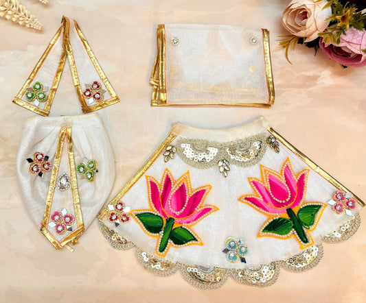 RK / Yugal Sarkar/ Laxmi ji & Ganesh ji Set White Pink Lotus Lehenga & Dhoti - 6 piece set