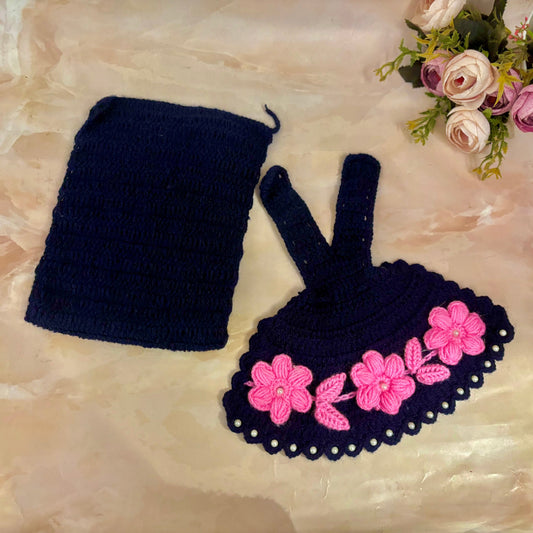 Green & Pink Flower Woollen Mata Rani Lehenga, Choli & Patka