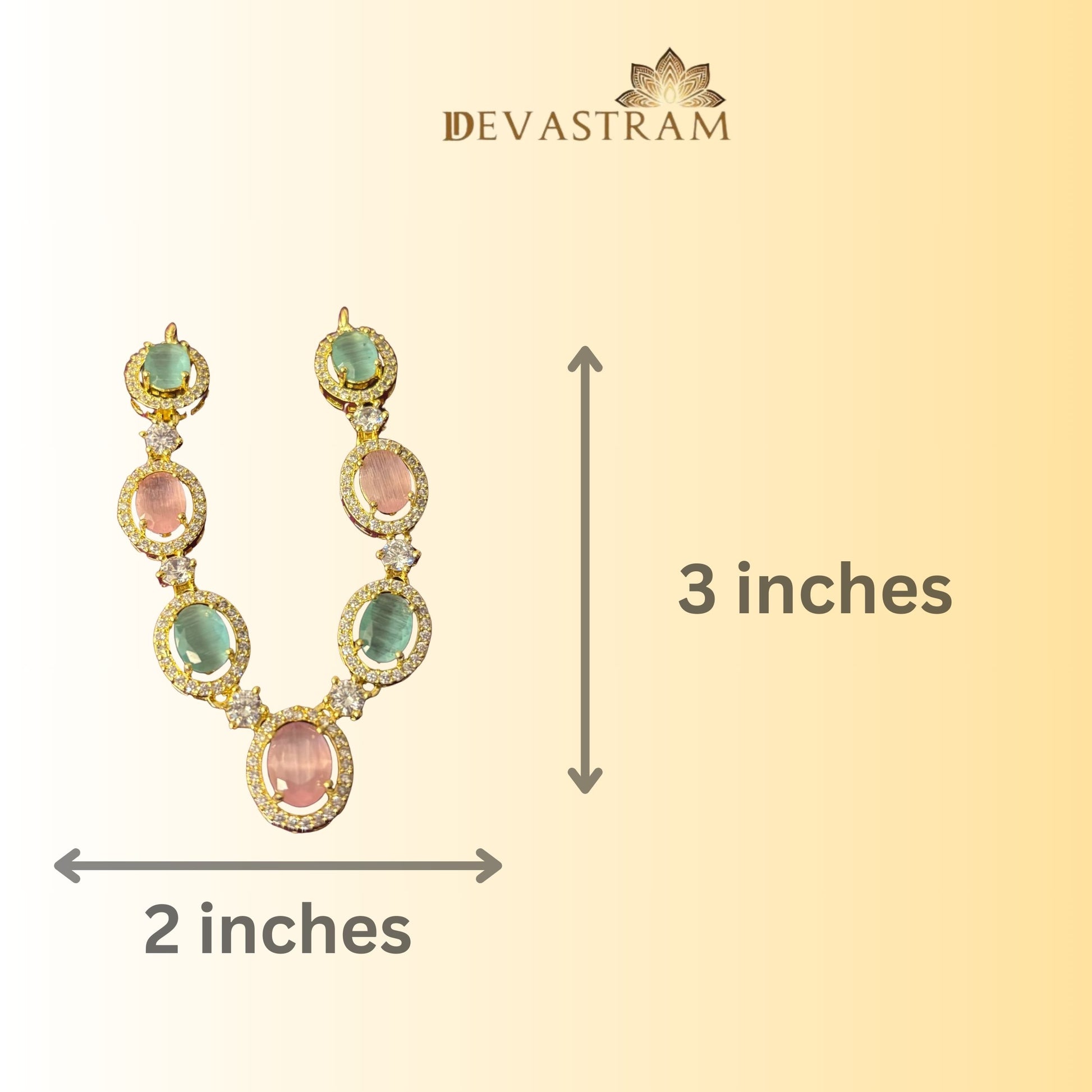 The Amritamani Pastel Necklace features exquisite oval-cut pastel gemstones in Aqua Blue & Blush Pink, bordered with micro-pave diamonds, creating a soft and divine glow that enhances the elegance of your deity.