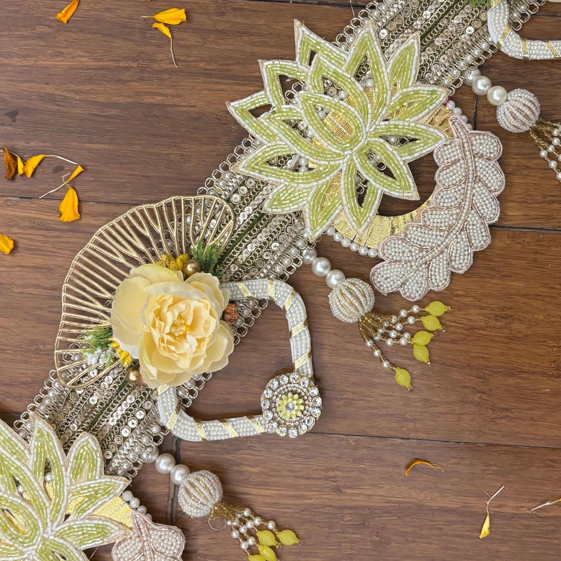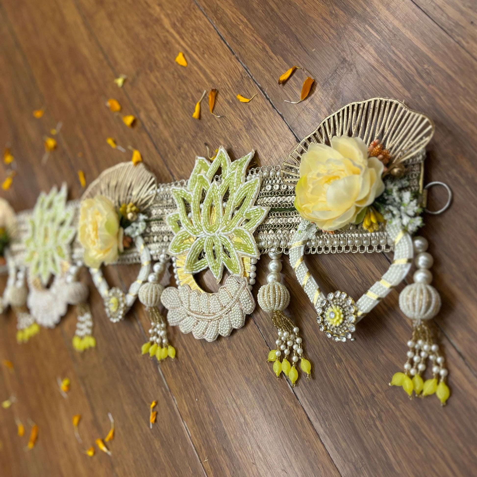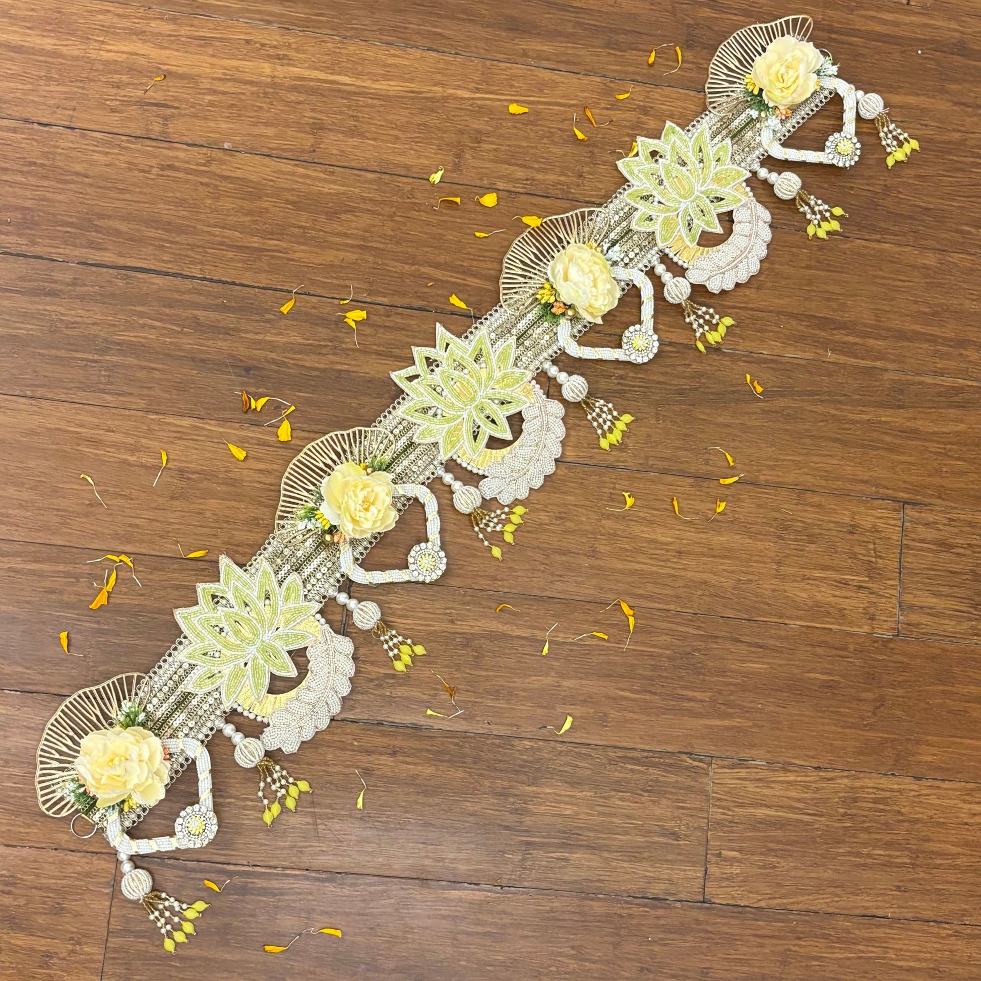 Bring a soft celestial glow to your festive spaces with the Aurora Lotus Toran, adorned with beaded pastel-yellow lotus blooms, shimmering crystal accents, delicate pearls, and airy floral details — radiating the serene beauty of dawn’s first light.