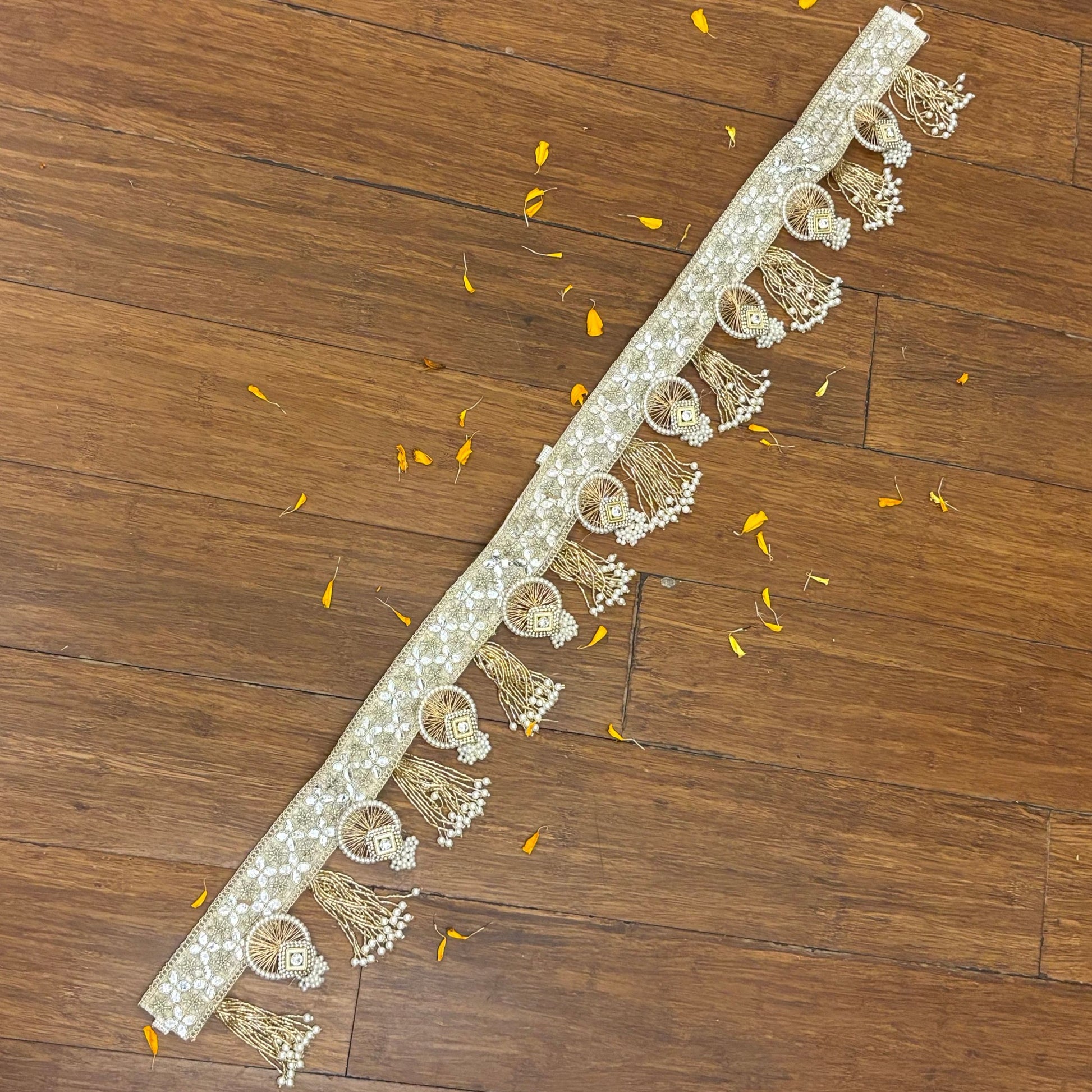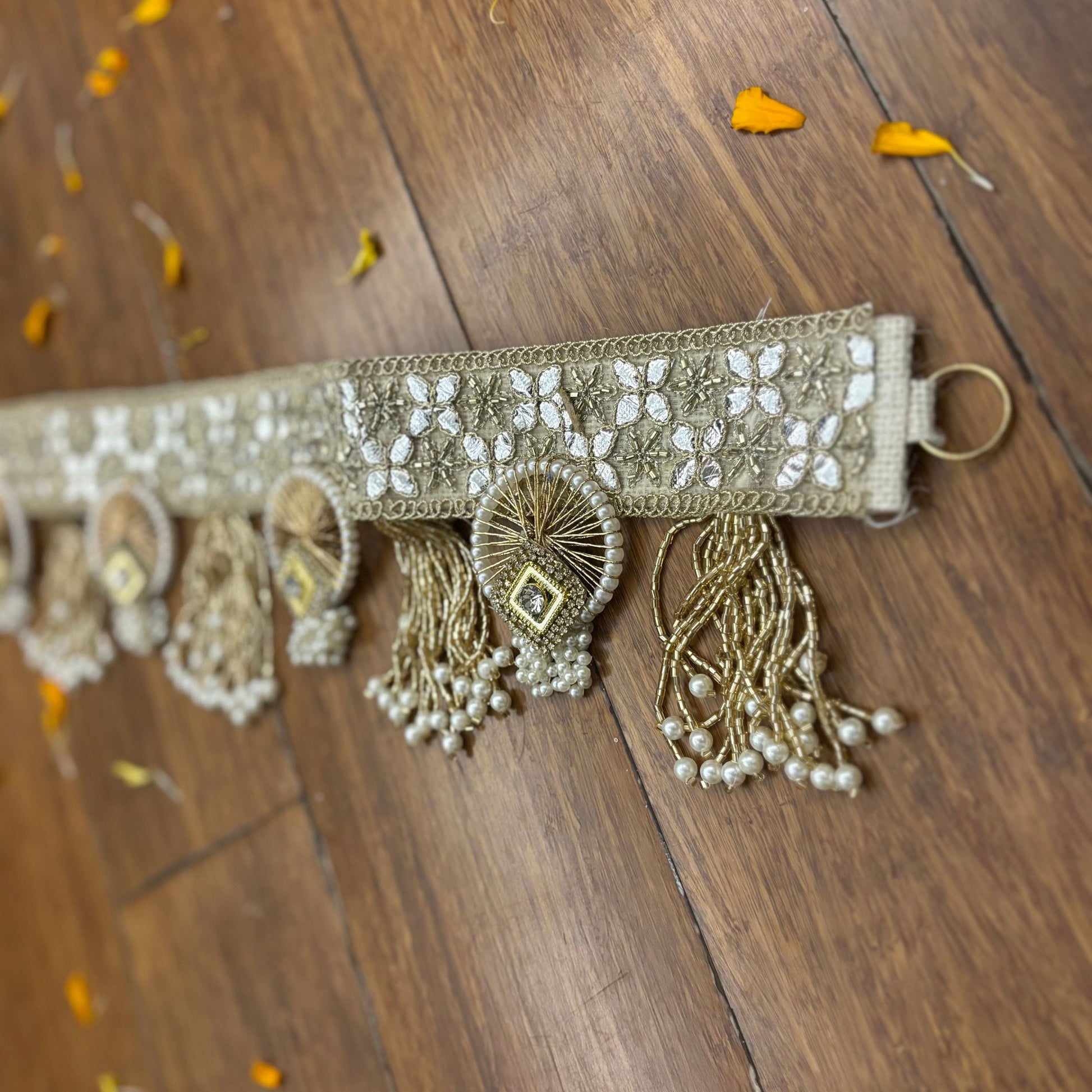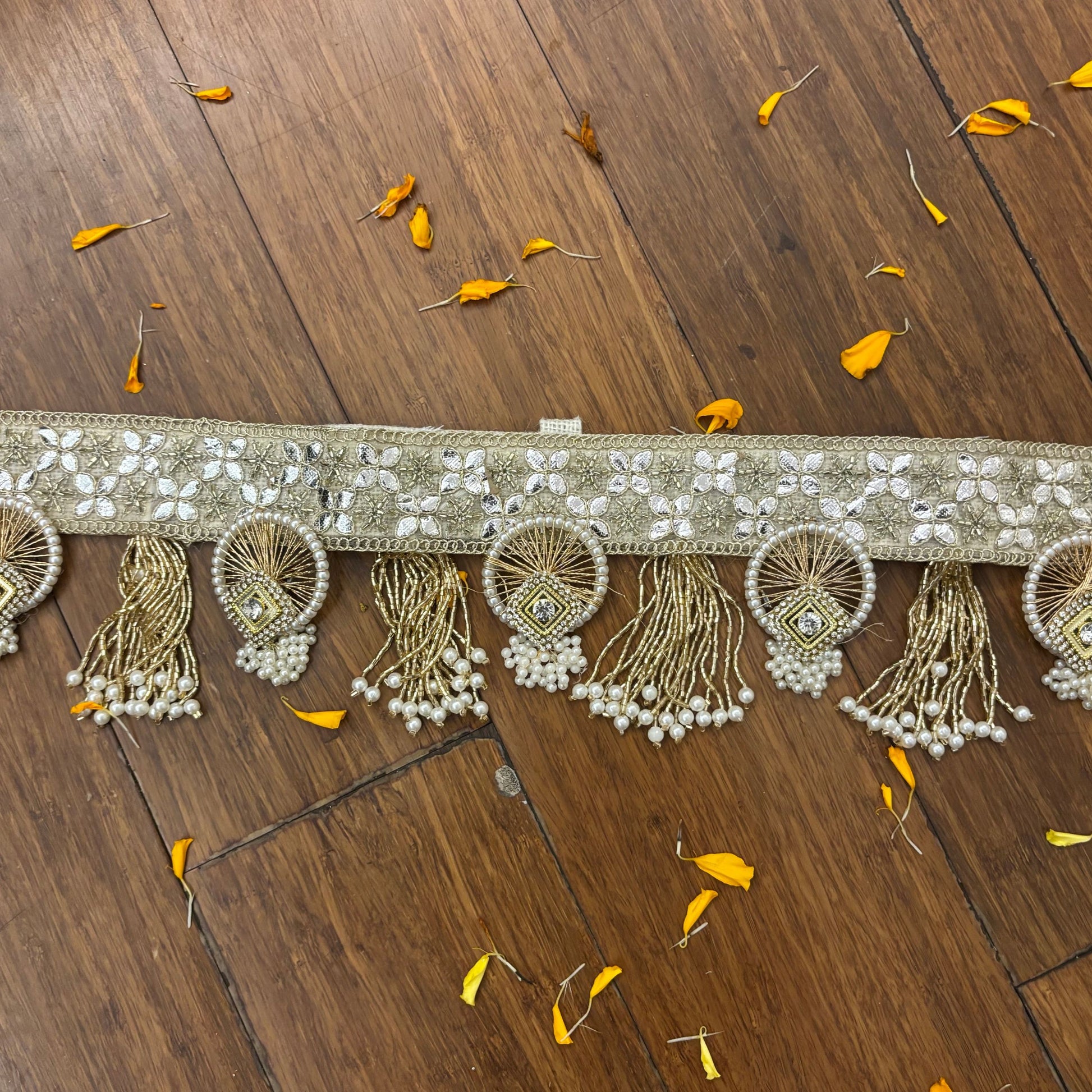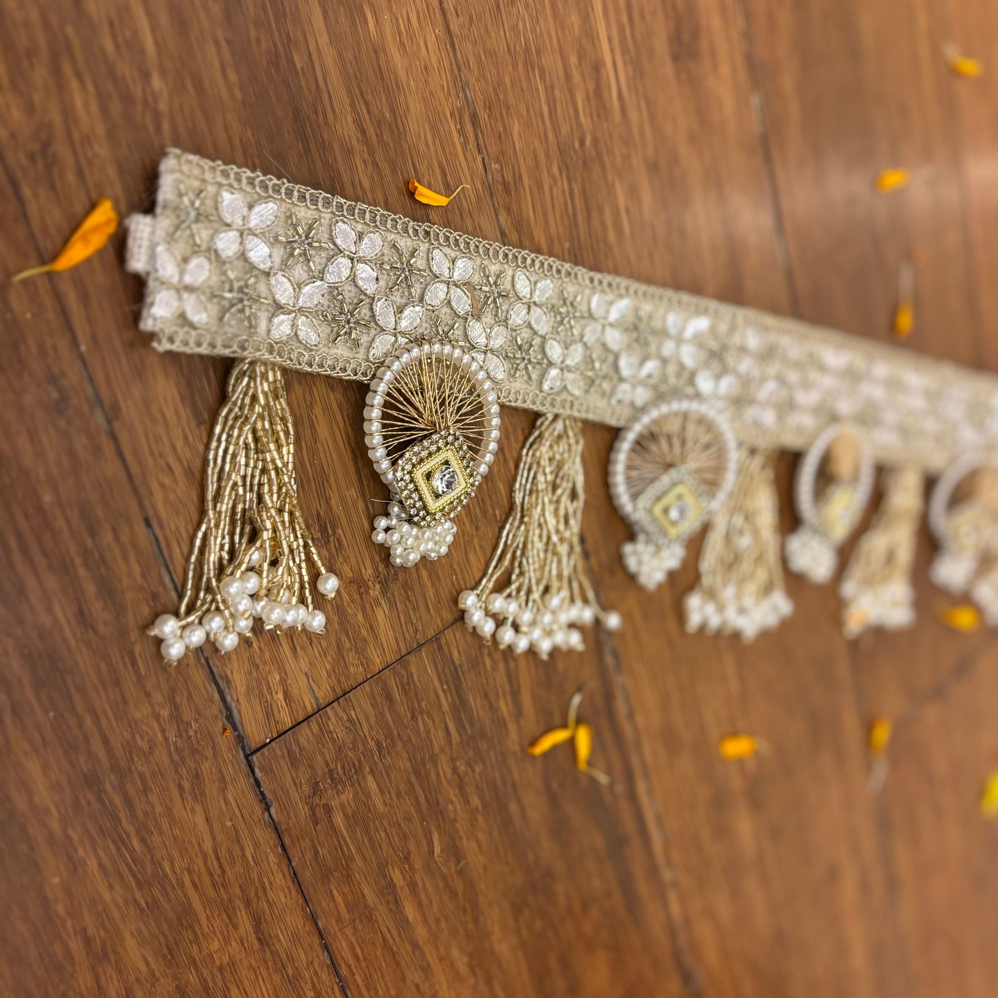 A stunning Halo Pearl Toran featuring intricate floral embroidery, sparkling mirror work, and halo-shaped pearl tassel charms, designed to elevate doorways and mandirs with a touch of modern elegance.