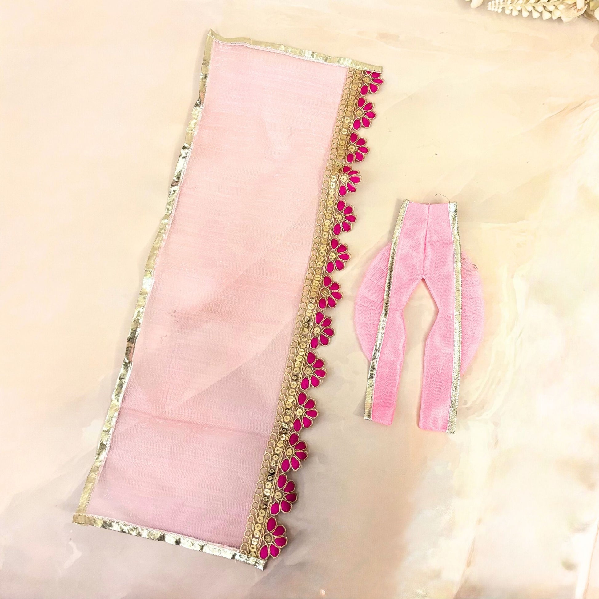 The Kamyarupa Mata Rani Dress is a graceful pink lehenga-choli set adorned with delicate floral gota work and light stone embellishments. It includes a soft net dupatta to complete the divine look, perfect for daily darshan or festive pujas.