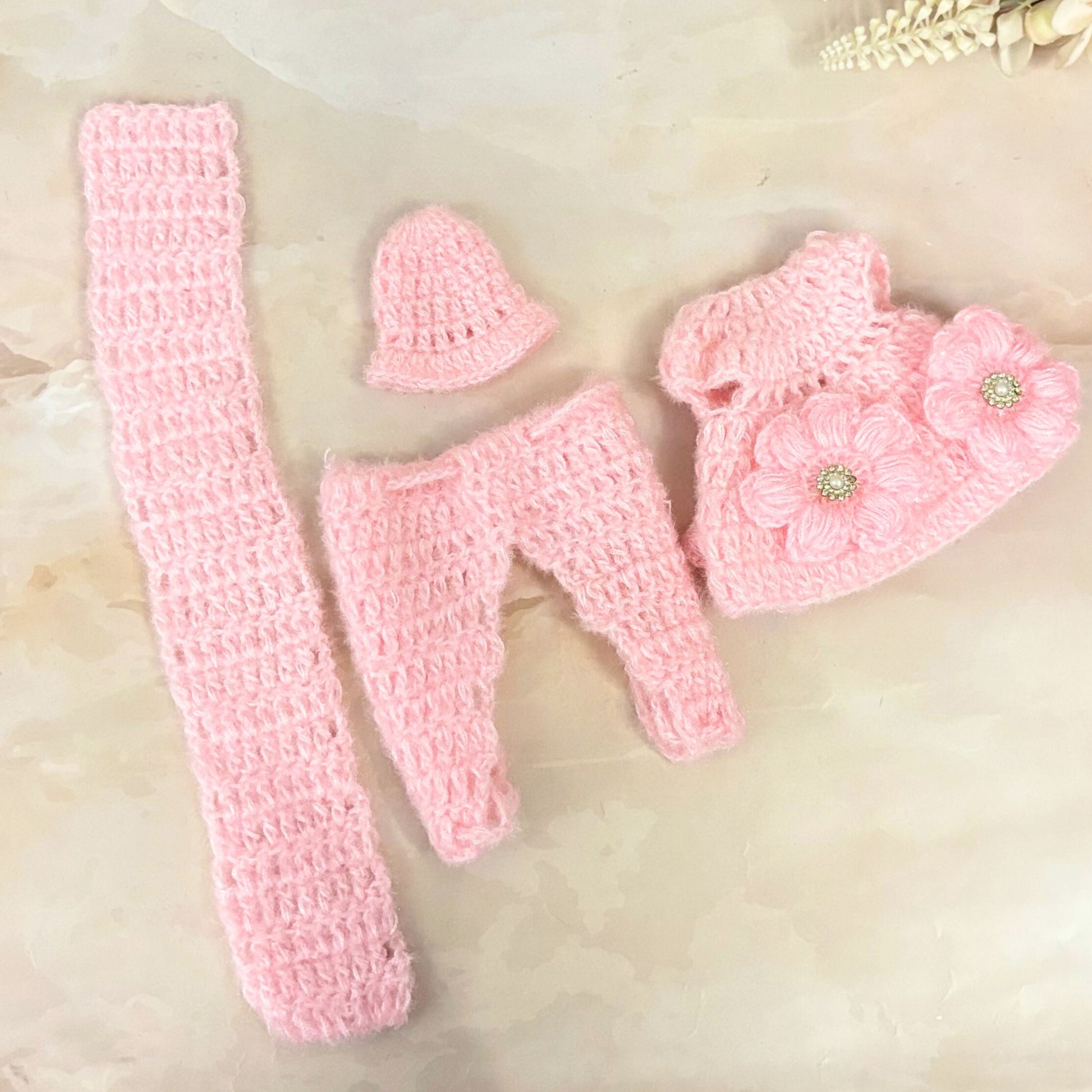 Komalraag Radha Krishna Woollen Dress — a soft and divine winter ensemble handcrafted in blush pink wool. Adorned with delicate hand-knitted flowers and shimmering stone centers, this matching Radha Krishna set radiates tenderness, warmth, and devotion.