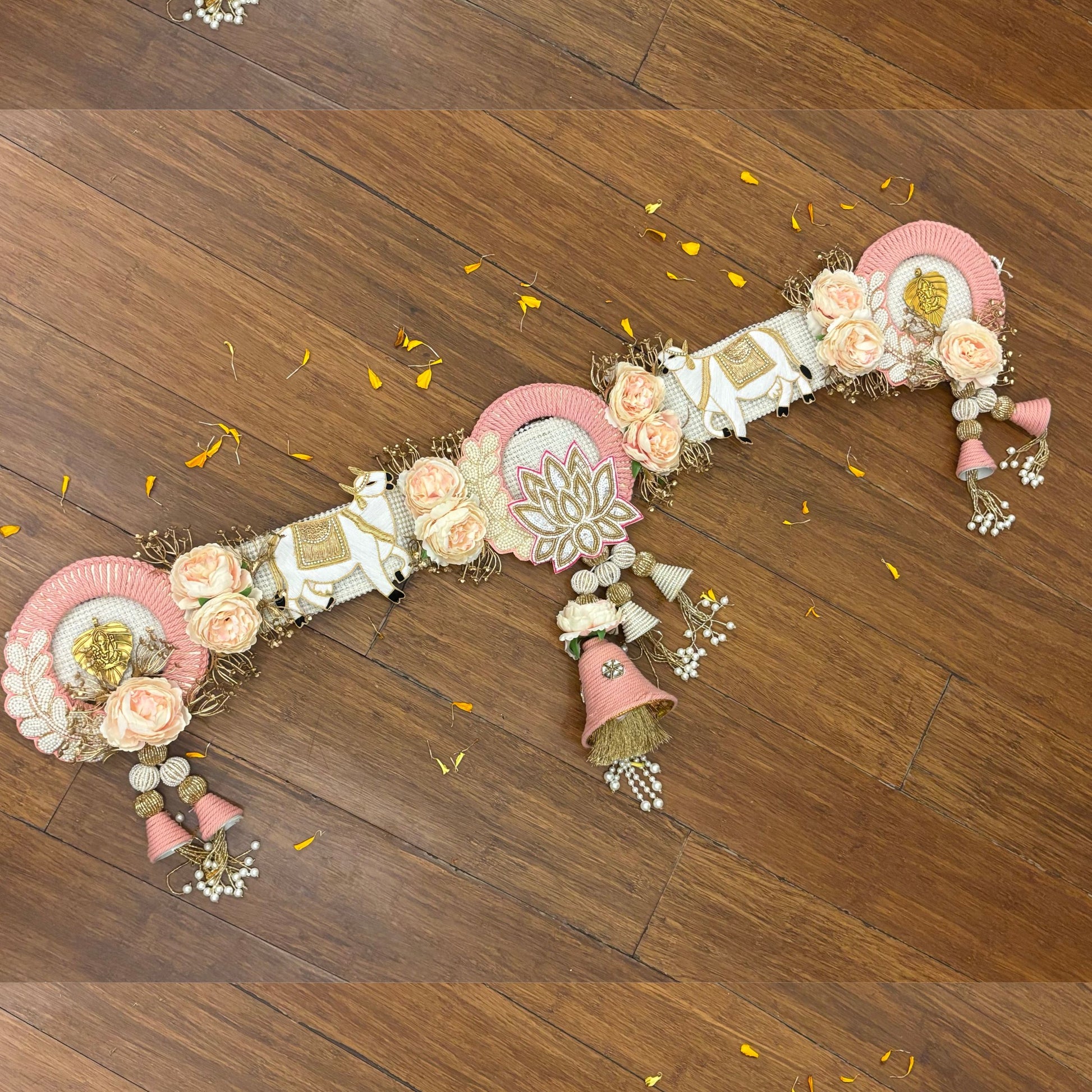 The Blush Lotus Heritage Toran blends soft blush pink tones, pearl-beaded lotus motifs, sacred cow embroidery, and delicate ivory florals with gold-tasseled drops, bringing a graceful pastel charm to festive doorways and mandirs.