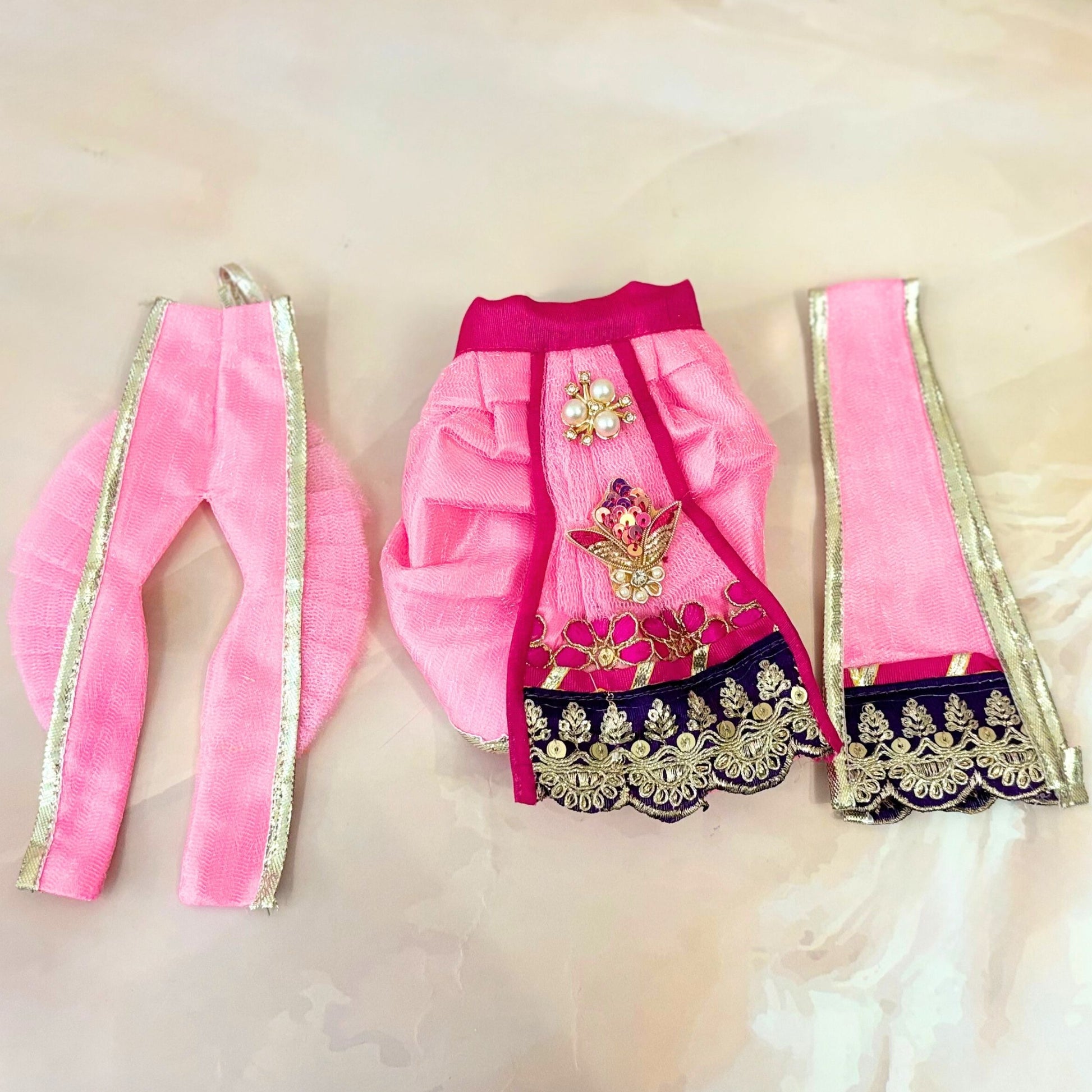 The Madhurima Radha Krishna Dress is a charming blend of soft pink with deep purple borders, highlighted with golden zari embroidery and delicate embellishments.. Ideal for Janmashtami, Radha Ashtami, and festive puja celebrations.
