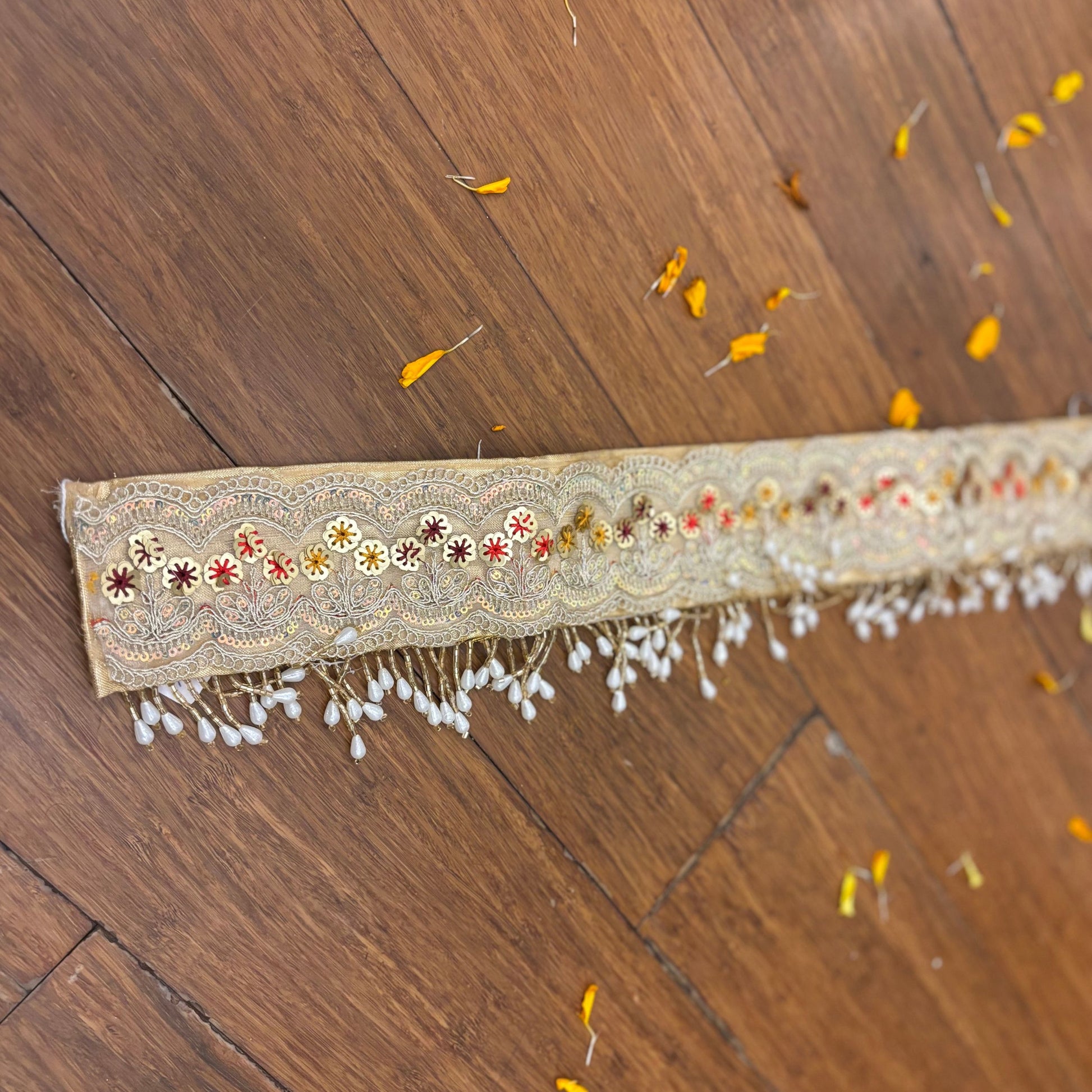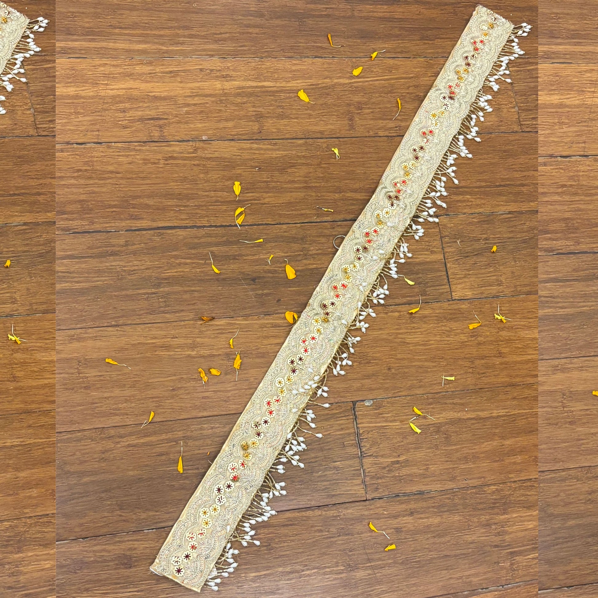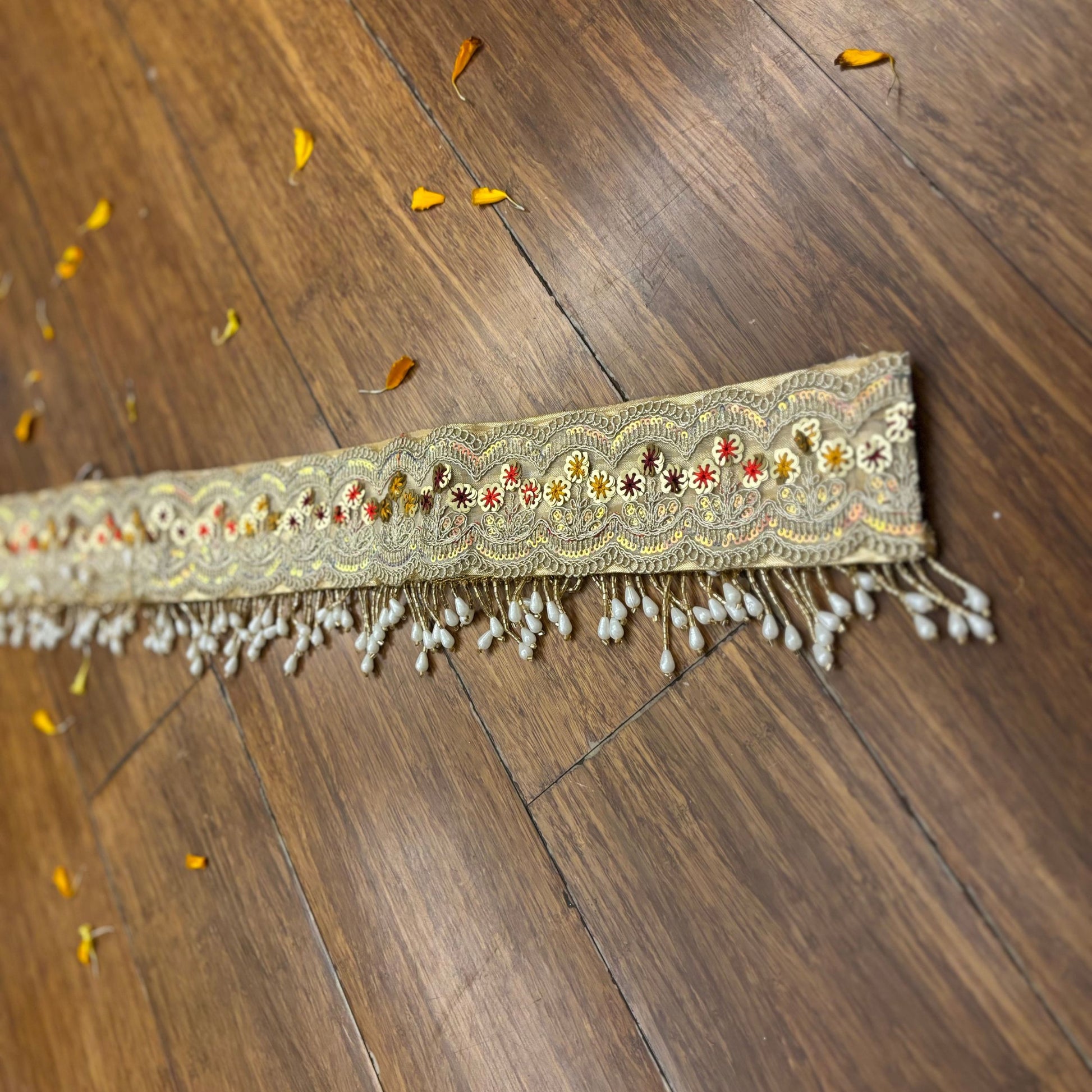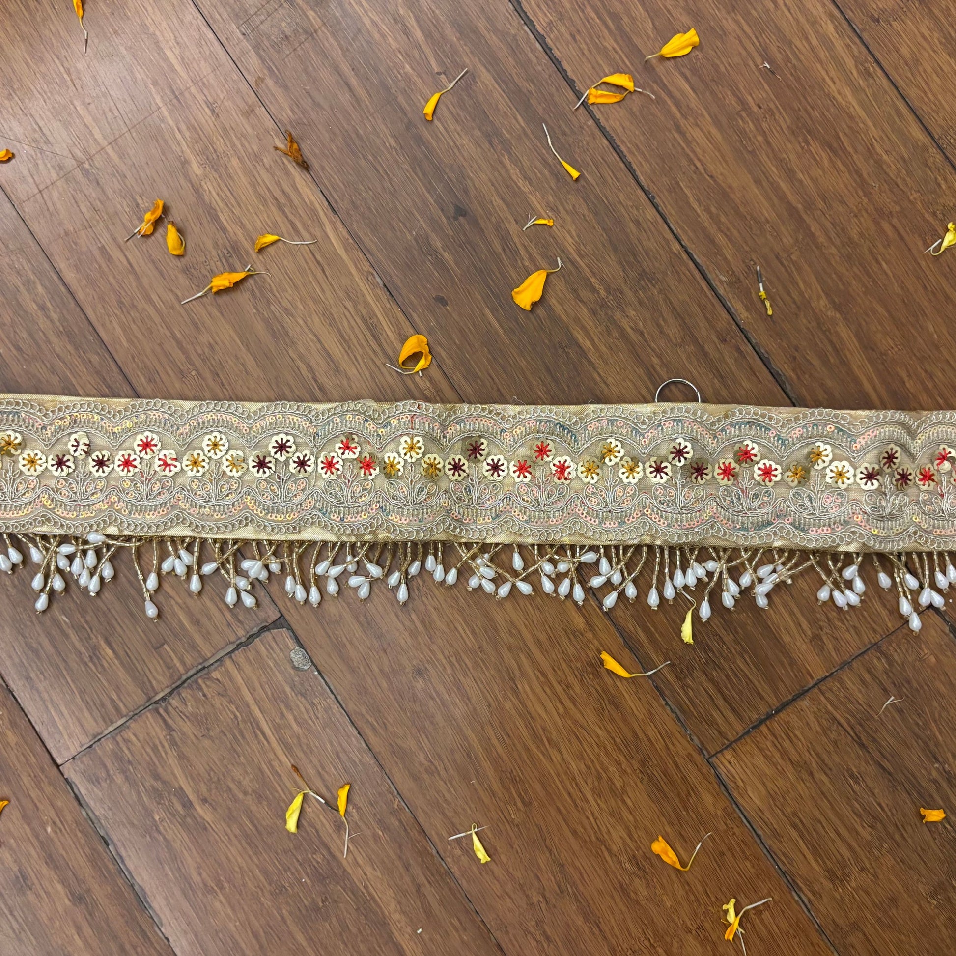 Bring a touch of nature indoors with the Meadow Bloom Toran, featuring delicate multicolour floral embroidery on golden lace, finished with dainty pearl droplet tassels — perfect for brightening up doorways and mandirs with soft festive charm.
