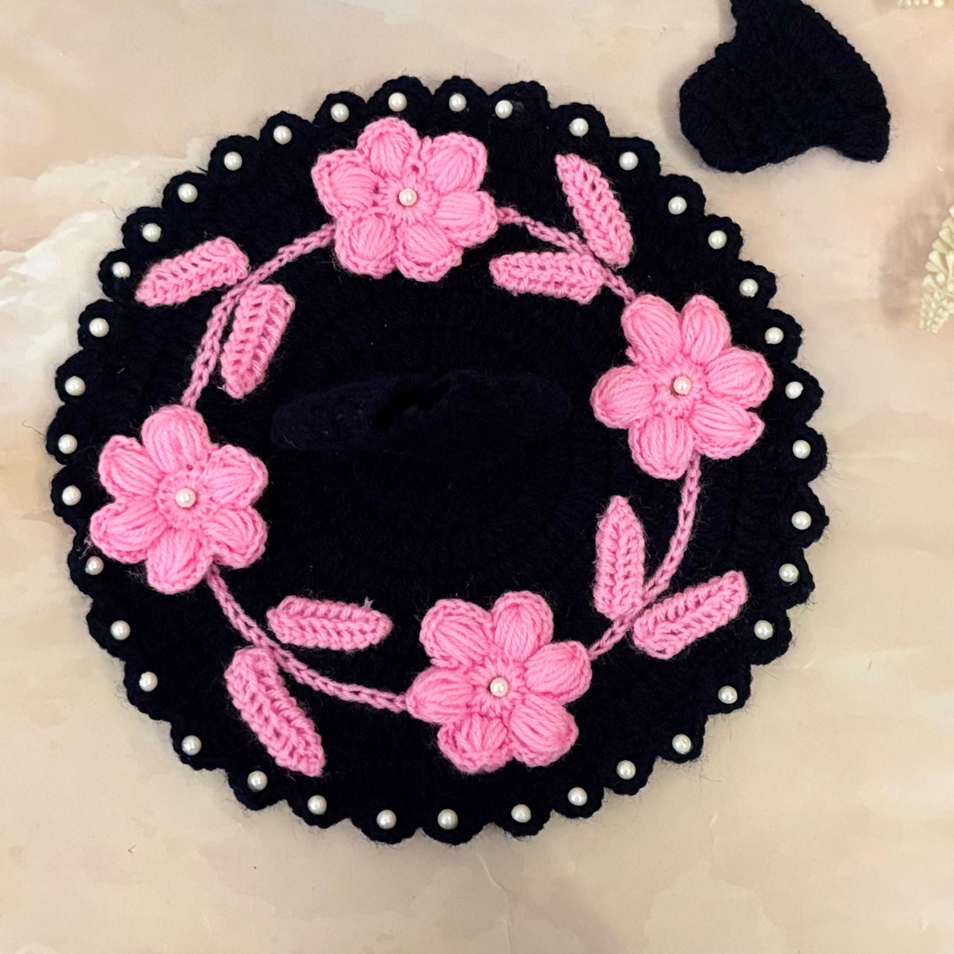 Neelraj Laddu Gopal Woollen Dress — a royal winter ensemble handcrafted in soft navy wool, beautifully adorned with pink floral motifs and tiny pearl accents. This premium dress keeps your Kanha Ji warm and stylish during the winter season.