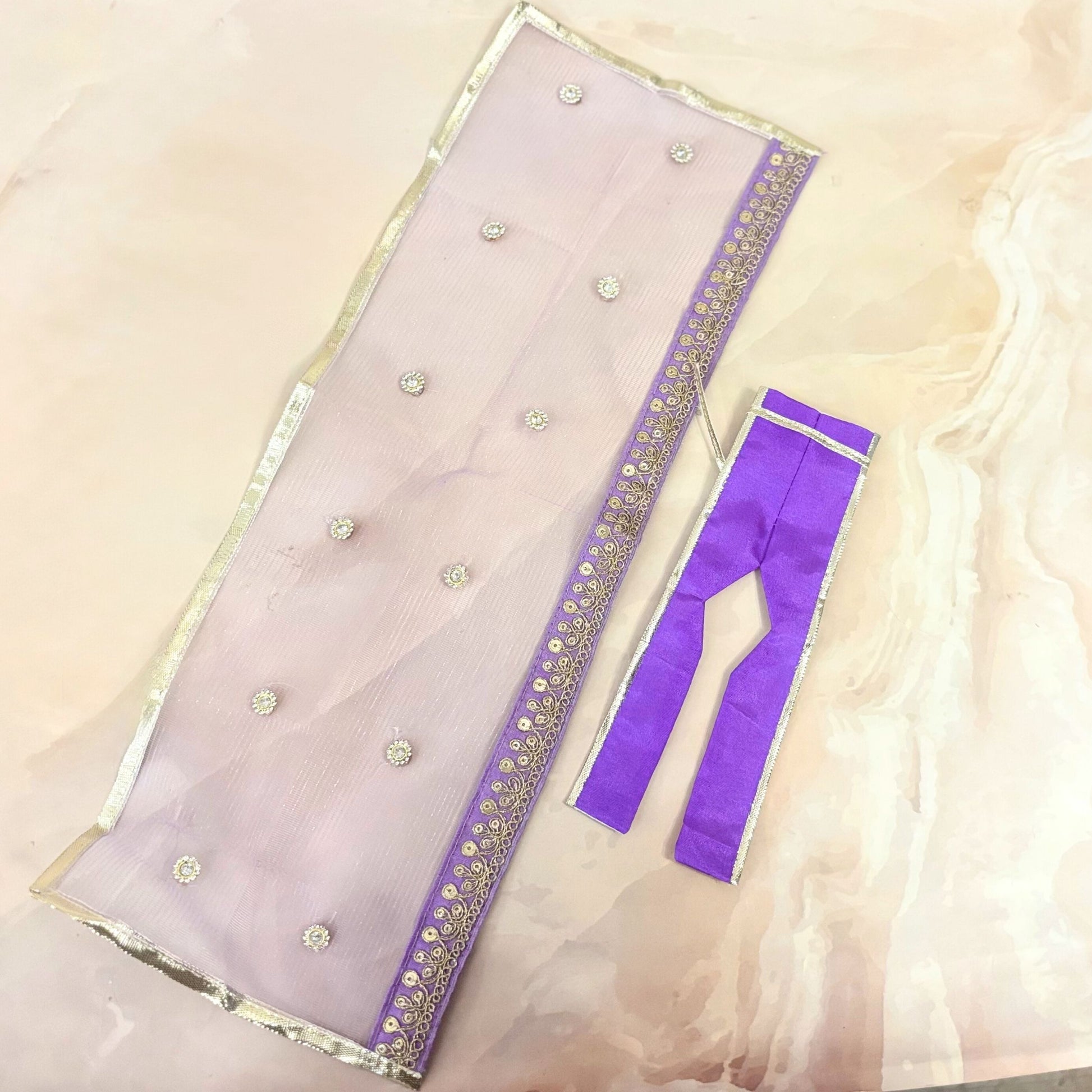 The Rajlavanya Radha Krishna Dress set radiates divine elegance in royal purple, adorned with intricate golden and stone embellishments.