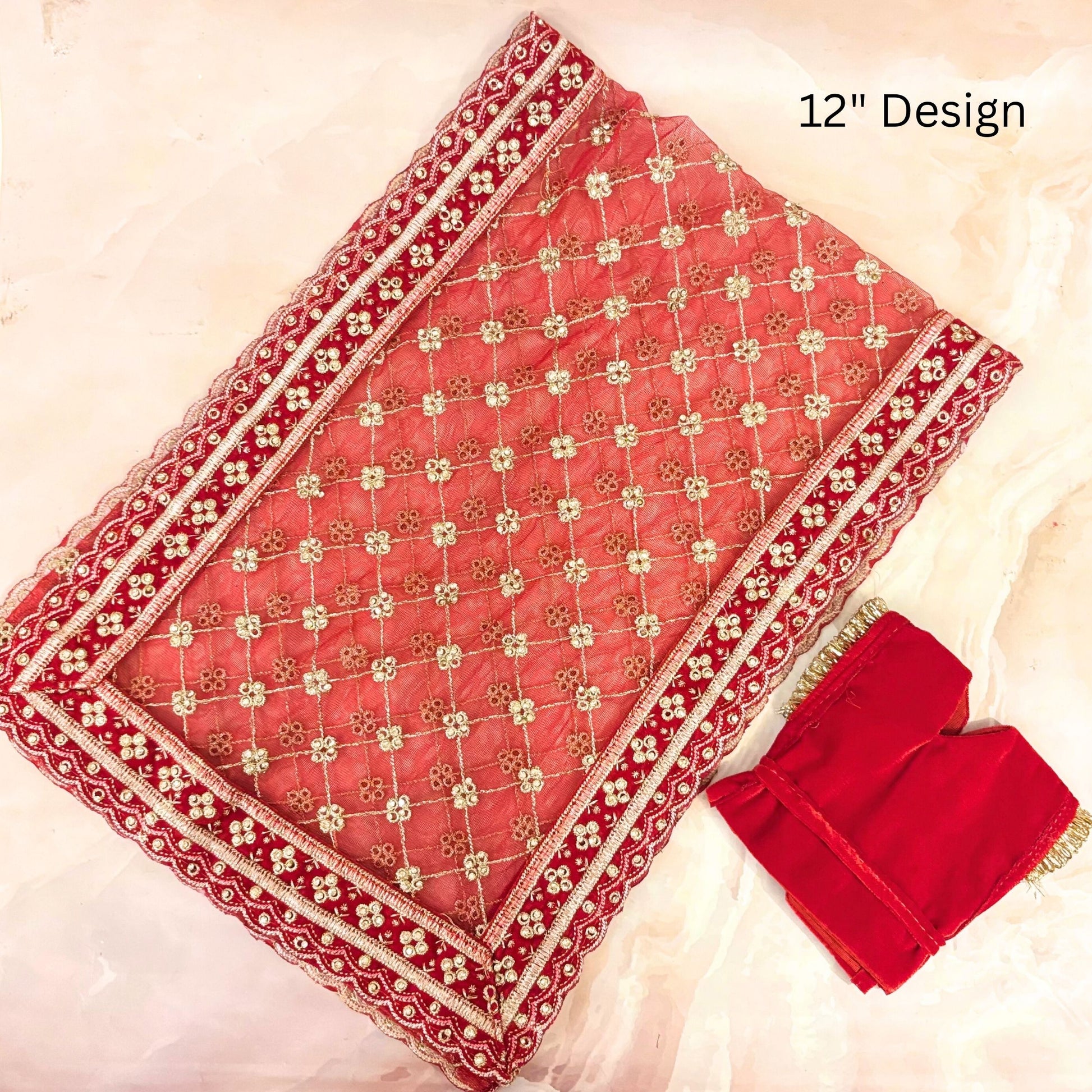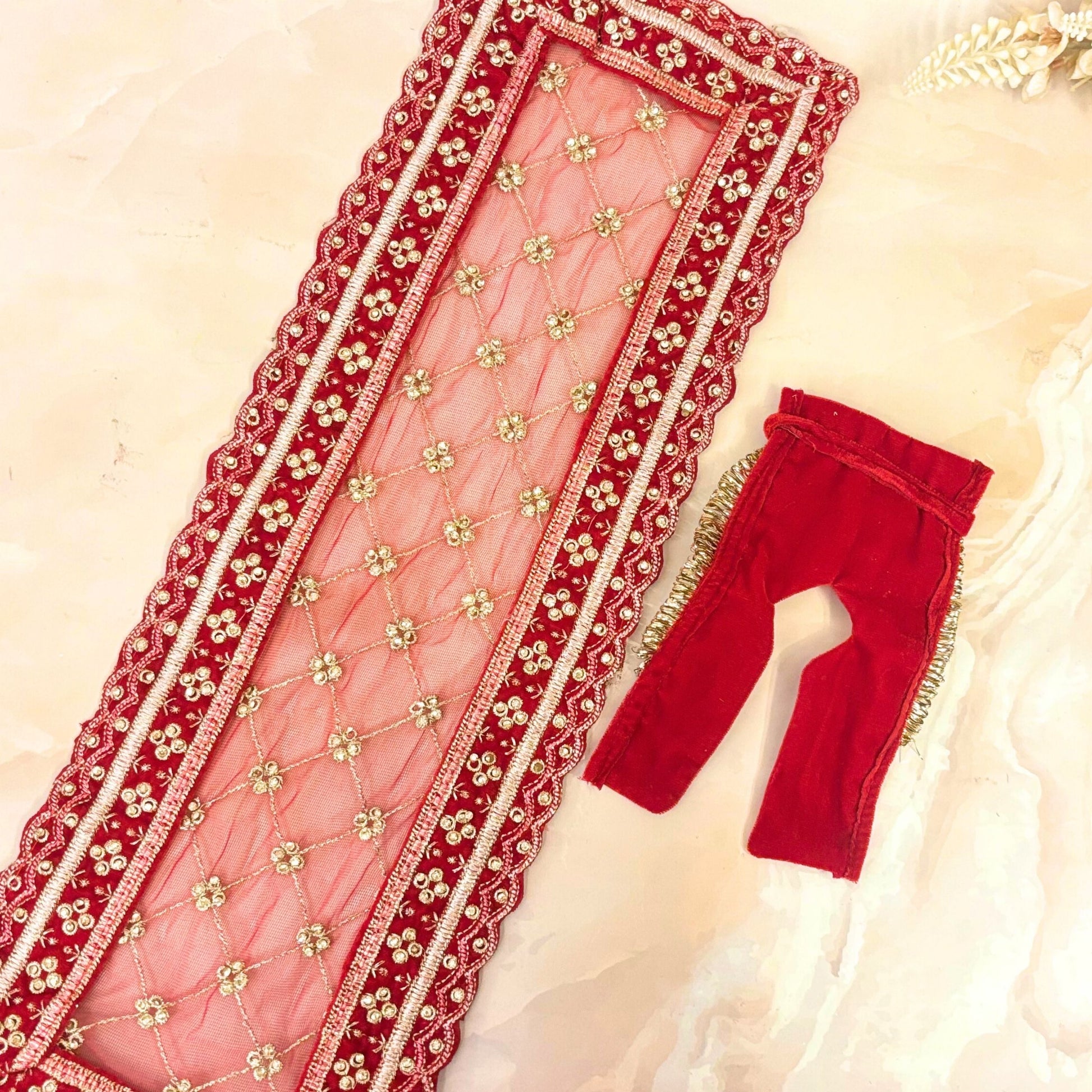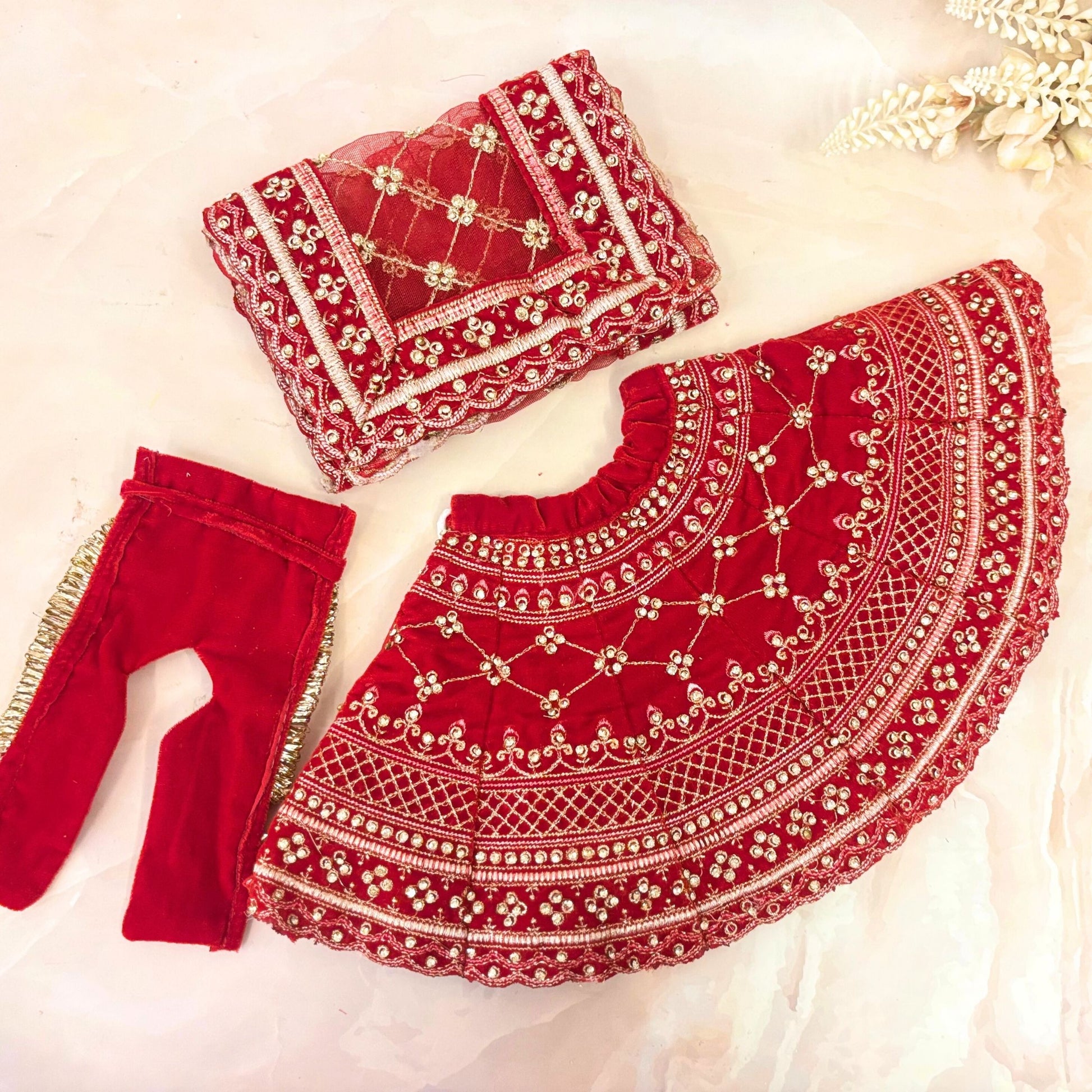 The Rudrāmbarā Mata Rani Dress is a majestic attire crafted in premium velvet fabric, radiating deep red grandeur. Designed as a heavy dress, it features intricate embroidery, sequin embellishments, and zari borders that enhance its divine elegance.