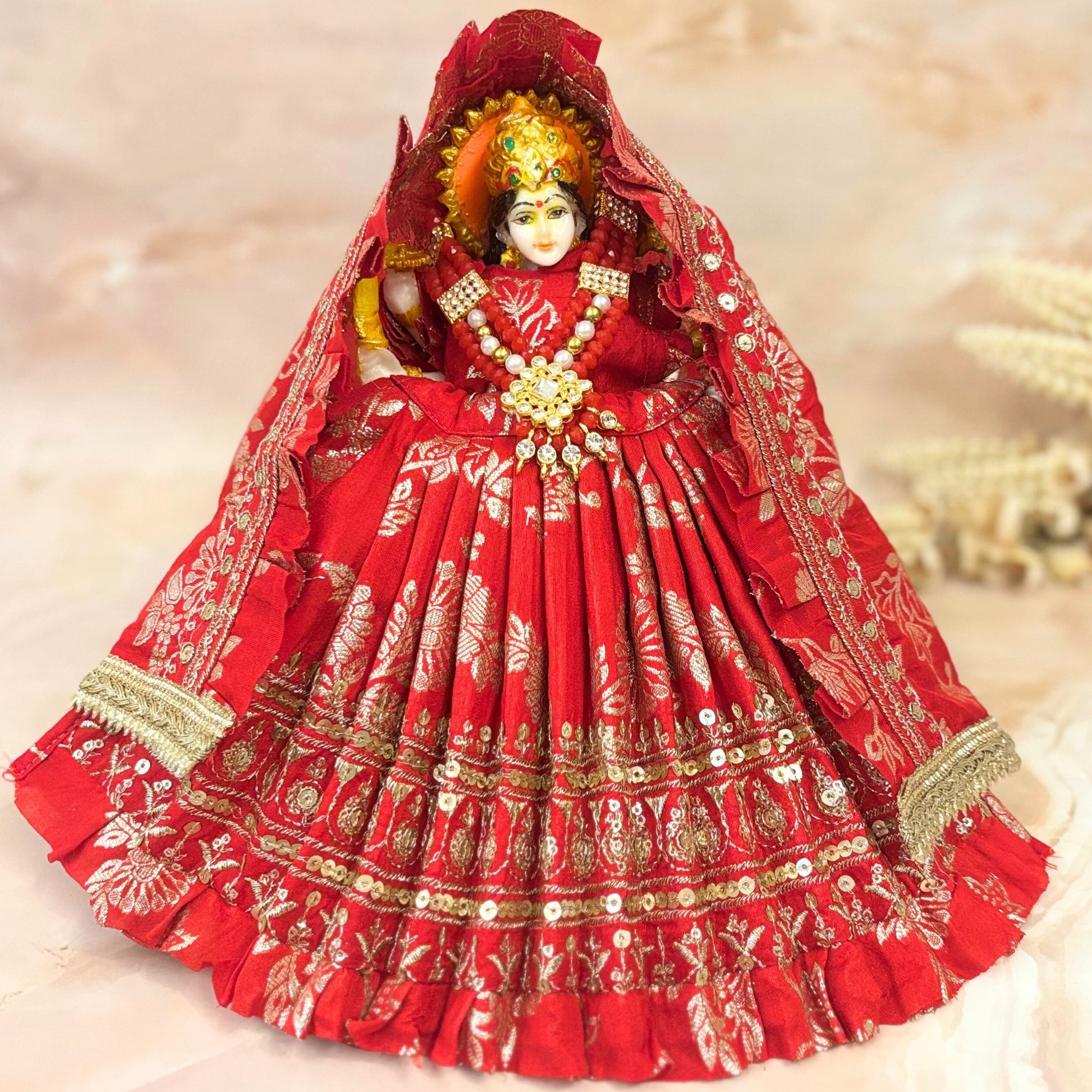 The Rudrapriya Mata Rani Dress is crafted in a rich red shade with intricate golden work, exuding grace and divinity. Enhanced with delicate motifs and fine detailing, this attire is perfect for adorning Mata Rani during Navratri, Chowki, and other auspicious rituals, radiating traditional charm and elegance.